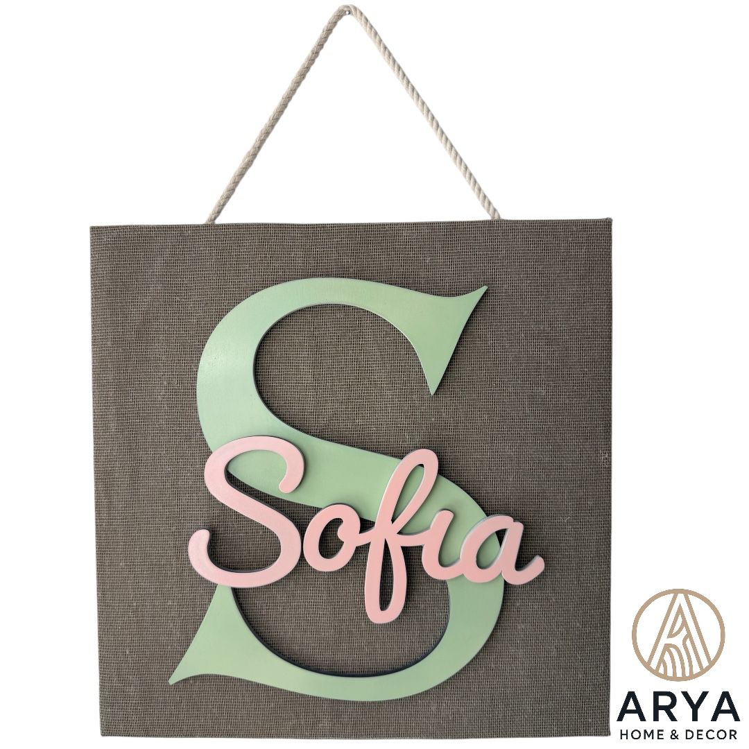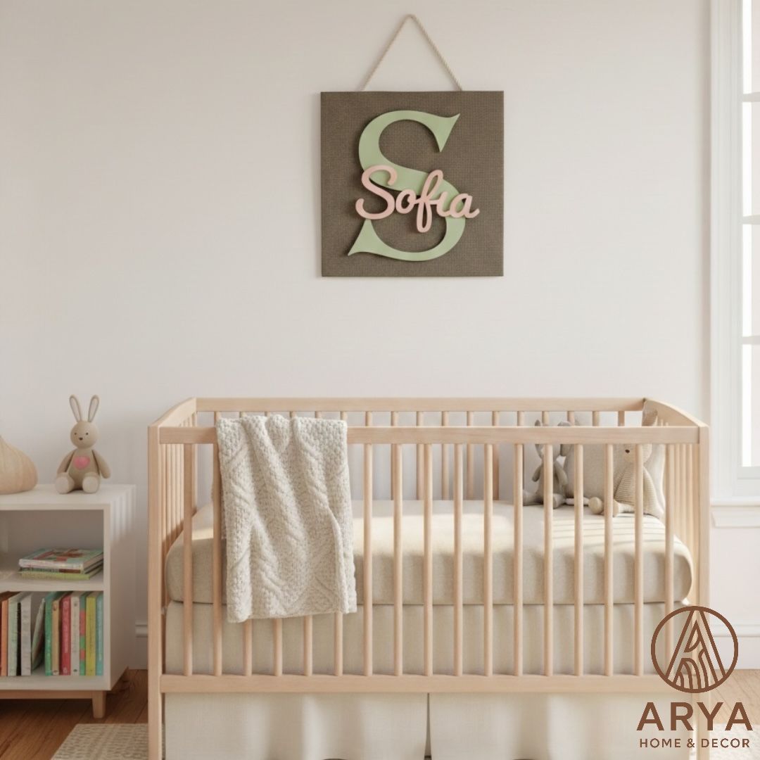 Este diseño incluye una inicial en tamaño protagonista acompañada del nombre completo al frente, creando una pieza elegante, tierna y atemporal que combina perfecto con cualquier estilo de decoración infantil.