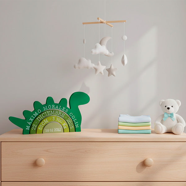 Personalizamos cada pieza con el nombre del bebé, fecha de nacimiento, hora, peso y medidas, creando un recuerdo especial que acompañará la decoración de su cuarto.