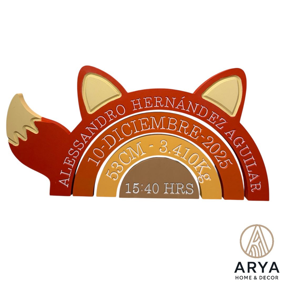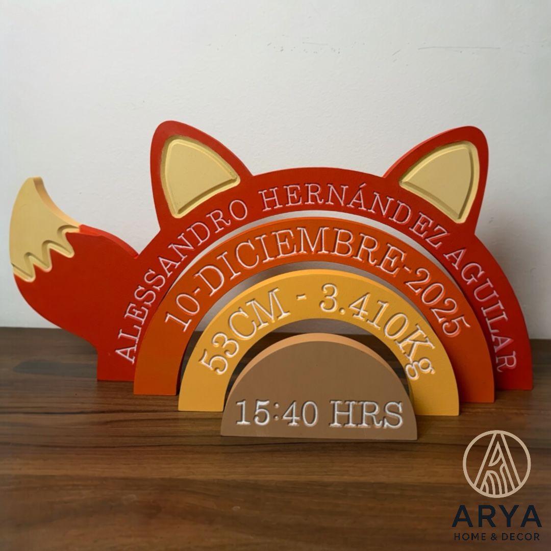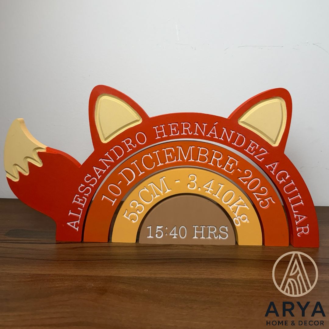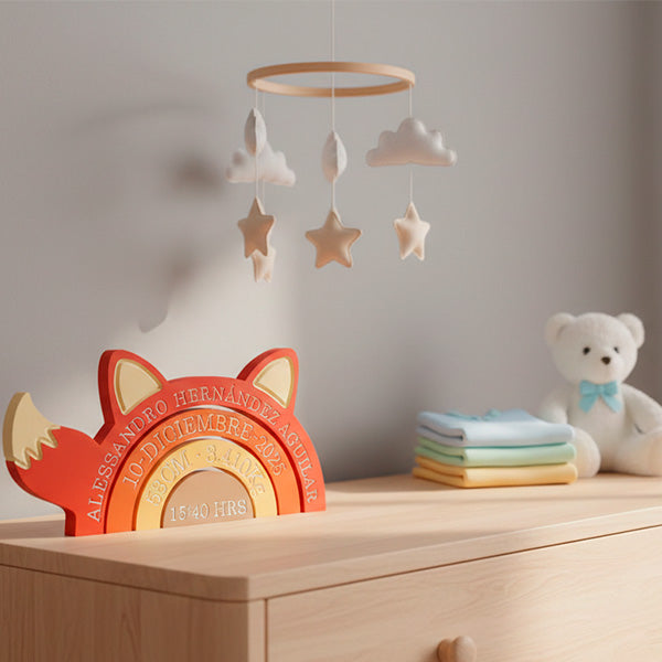 Personalizamos cada pieza con el nombre del bebé, fecha de nacimiento, hora, peso y medidas, creando un recuerdo especial que acompañará la decoración de su cuarto.